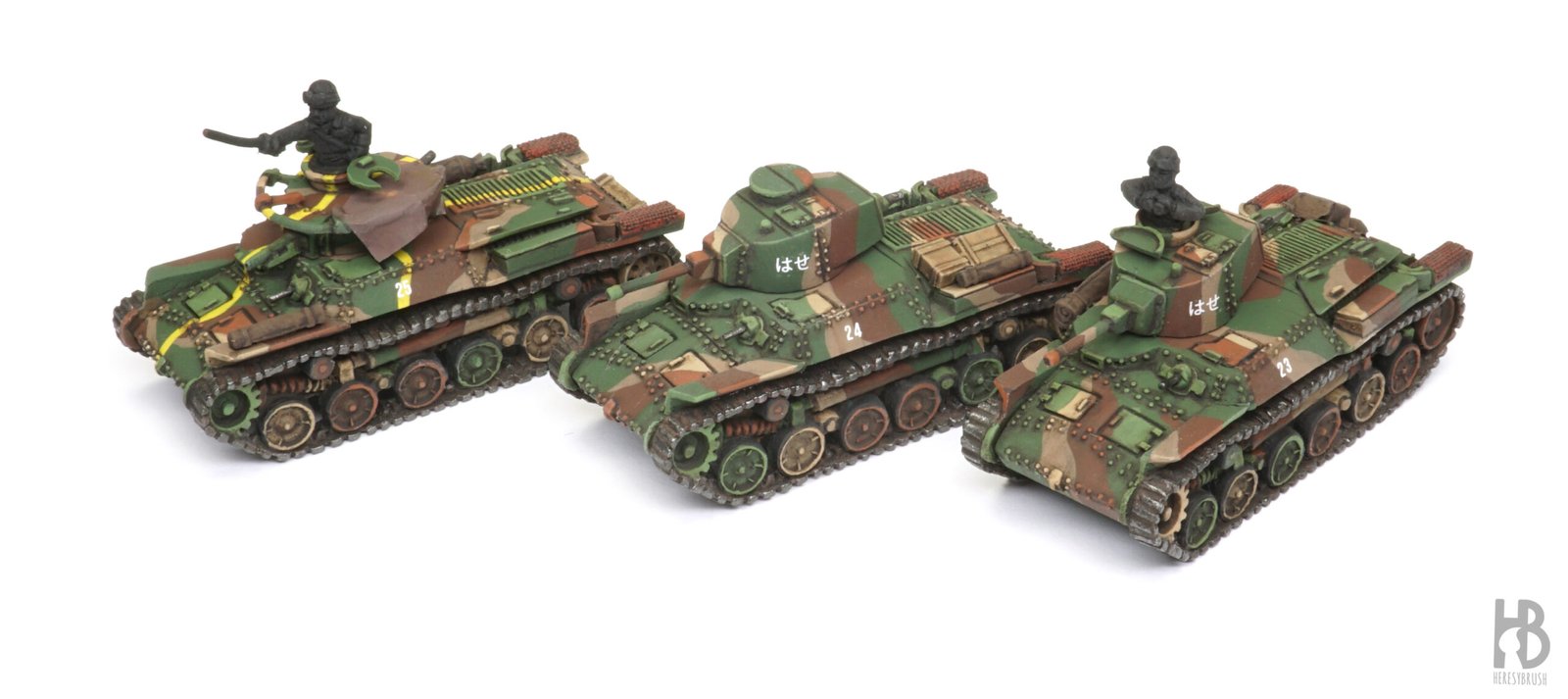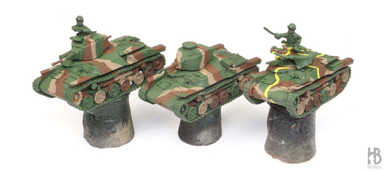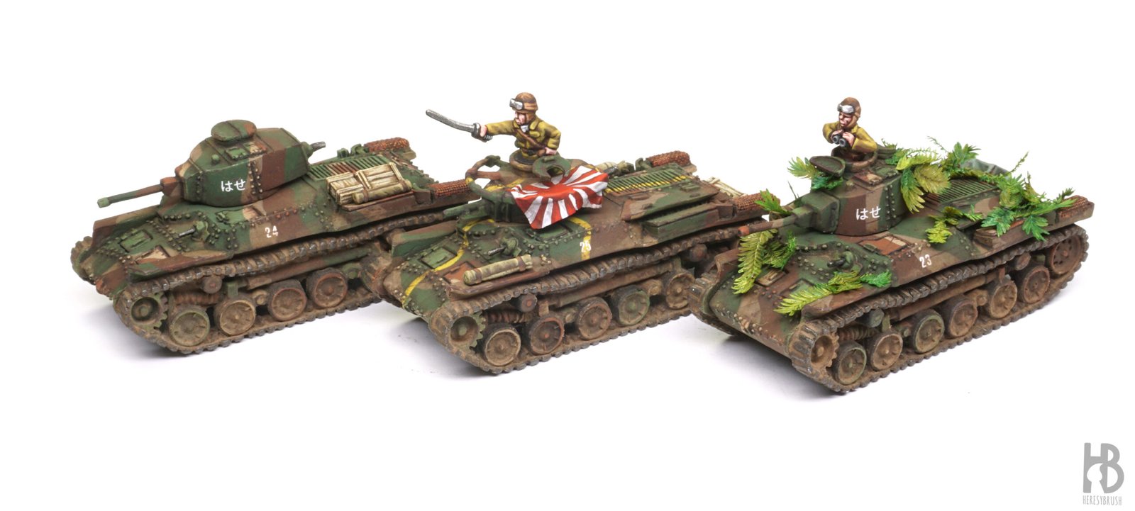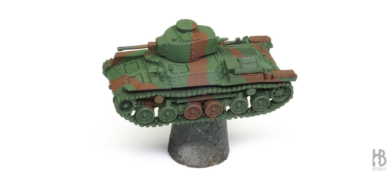 For this tutorial, we will be using one of the newly released Japanese tanks by Battlefront Miniatures in 15mm (scale 1:100), the Type 97 Chi-Ha, the workhorse of the Imperial Japanese Army during World War II. In the early years of the war, Japanese tanks were typically painted in khaki or yellow-brown, but as jungle combat intensified the army adopted a tritonal camouflage scheme. This pattern featured grass green (kusa iro), earth brown (tsuchi iro), and sand yellow (tsuchi kusa iro). As the war progressed, green became the standard base color, with camouflage patterns applied by individual units rather than at the factory and normally following hard-edge shapes. This led to a wide variety of unique, non-standardized patterns across different vehicles. In the early war period, it was also common to see hand-painted yellow stripes, often arranged in intersecting “+” or “X” shapes, adding a distinctive and stylized element to Japanese tank camouflage. These vehicles were not typically repainted, so such early camouflage patterns remained visible on older tanks right up until the end of the war.