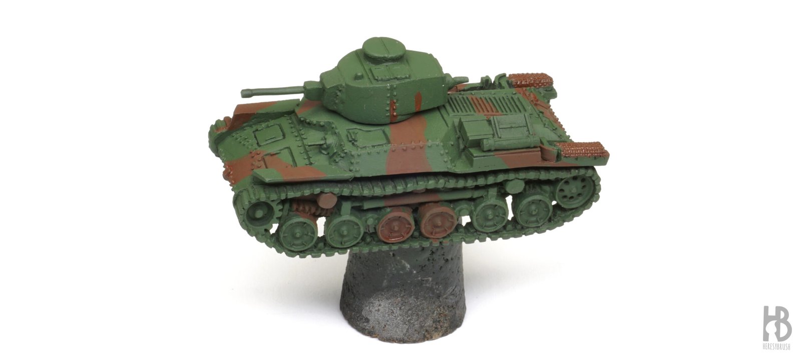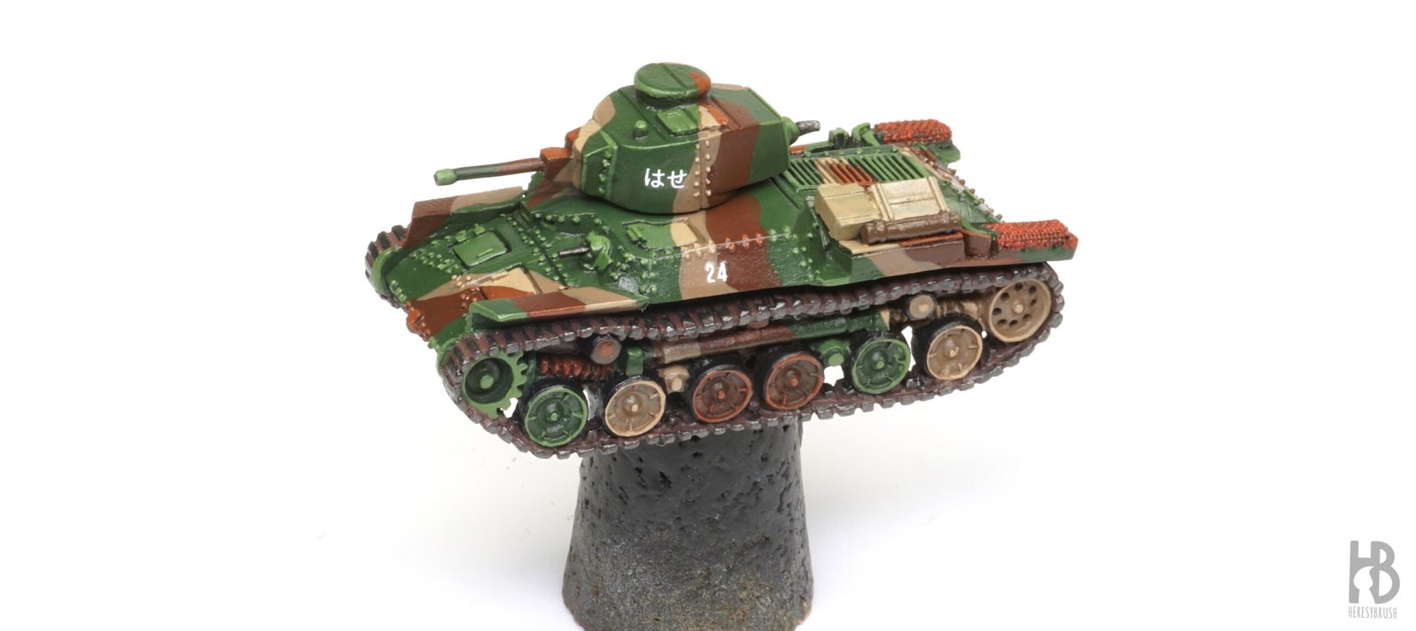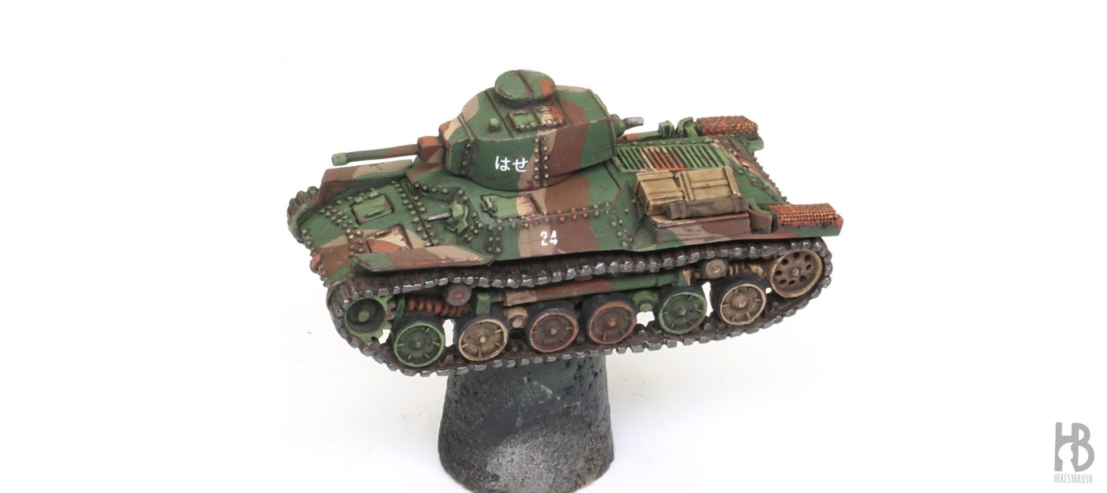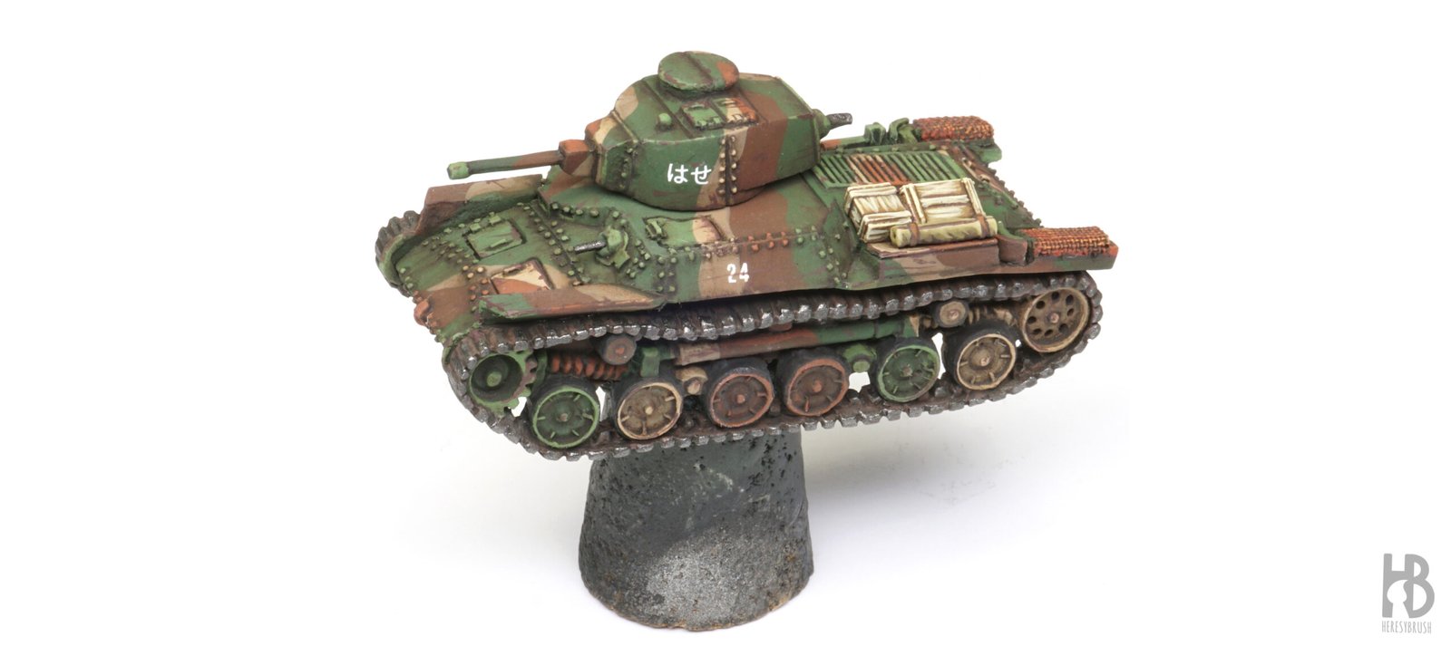 For this tutorial, we will be using one of the newly released Japanese tanks by Battlefront Miniatures in 15mm (scale 1:100), the Type 97 Chi-Ha, the workhorse of the Imperial Japanese Army during World War II. In the early years of the war, Japanese tanks were typically painted in khaki or yellow-brown, but as jungle combat intensified the army adopted a tritonal camouflage scheme. This pattern featured grass green (kusa iro), earth brown (tsuchi iro), and sand yellow (tsuchi kusa iro). As the war progressed, green became the standard base color, with camouflage patterns applied by individual units rather than at the factory and normally following hard-edge shapes. This led to a wide variety of unique, non-standardized patterns across different vehicles. In the early war period, it was also common to see hand-painted yellow stripes, often arranged in intersecting “+” or “X” shapes, adding a distinctive and stylized element to Japanese tank camouflage. These vehicles were not typically repainted, so such early camouflage patterns remained visible on older tanks right up until the end of the war.