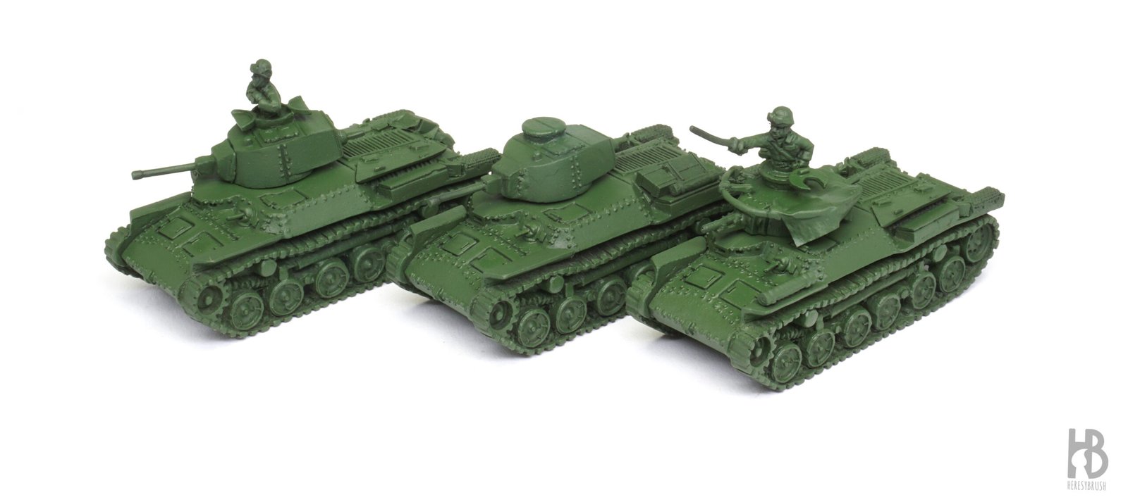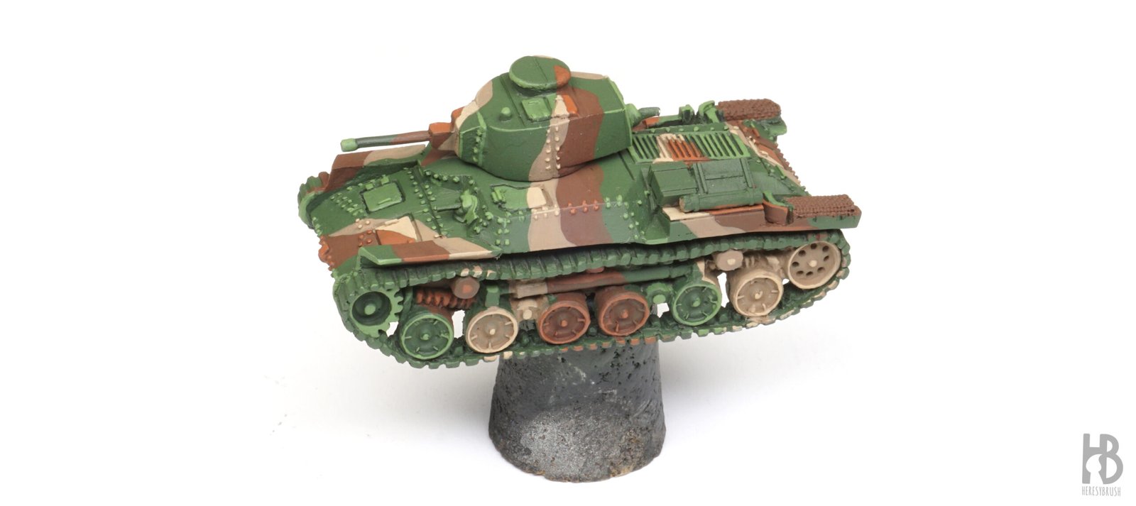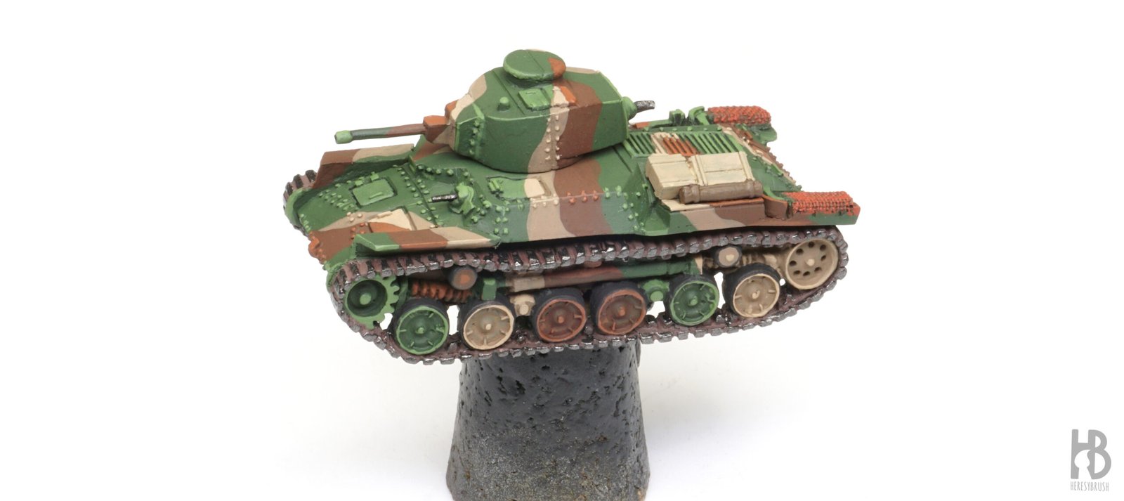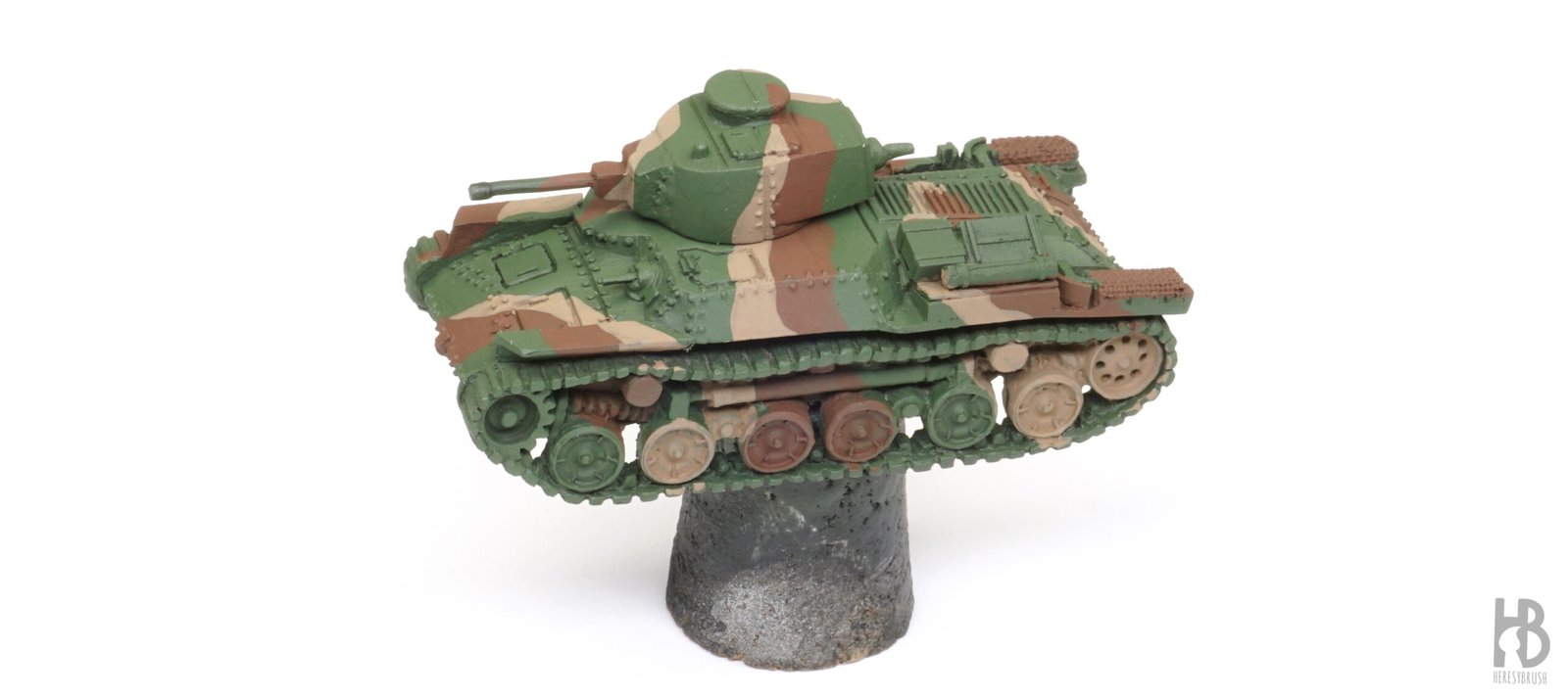 For this tutorial, we will be using one of the newly released Japanese tanks by Battlefront Miniatures in 15mm (scale 1:100), the Type 97 Chi-Ha, the workhorse of the Imperial Japanese Army during World War II. In the early years of the war, Japanese tanks were typically painted in khaki or yellow-brown, but as jungle combat intensified the army adopted a tritonal camouflage scheme. This pattern featured grass green (kusa iro), earth brown (tsuchi iro), and sand yellow (tsuchi kusa iro). As the war progressed, green became the standard base color, with camouflage patterns applied by individual units rather than at the factory and normally following hard-edge shapes. This led to a wide variety of unique, non-standardized patterns across different vehicles. In the early war period, it was also common to see hand-painted yellow stripes, often arranged in intersecting “+” or “X” shapes, adding a distinctive and stylized element to Japanese tank camouflage. These vehicles were not typically repainted, so such early camouflage patterns remained visible on older tanks right up until the end of the war.