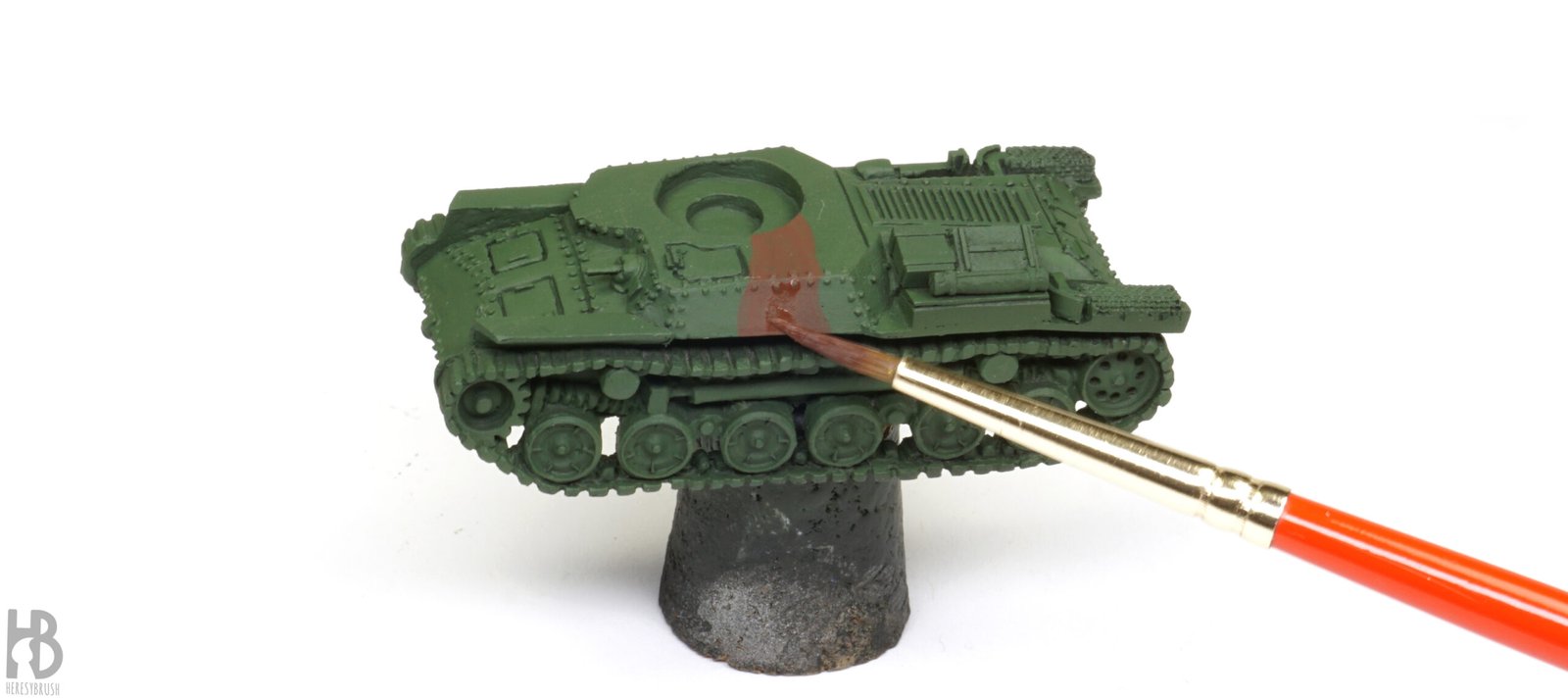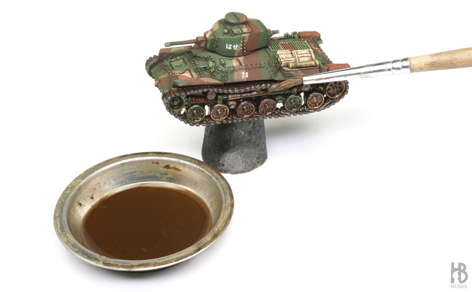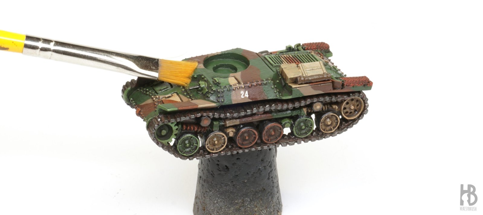 We then apply the pigment wash generously over the tracks and the lower part of the tank. Let the suspension flow naturally into the details to create a realistic dust buildup. A slightly irregular application will actually enhance the overall realism.