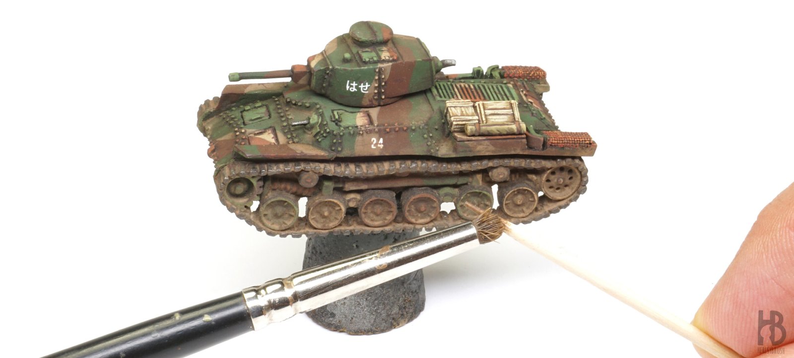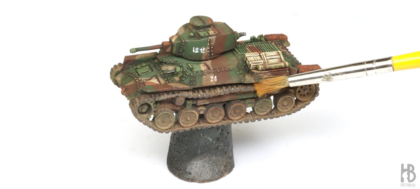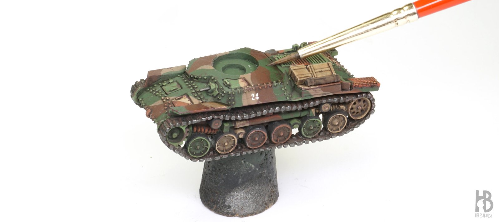 We then apply the pigment wash generously over the tracks and the lower part of the tank. Let the suspension flow naturally into the details to create a realistic dust buildup. A slightly irregular application will actually enhance the overall realism.
