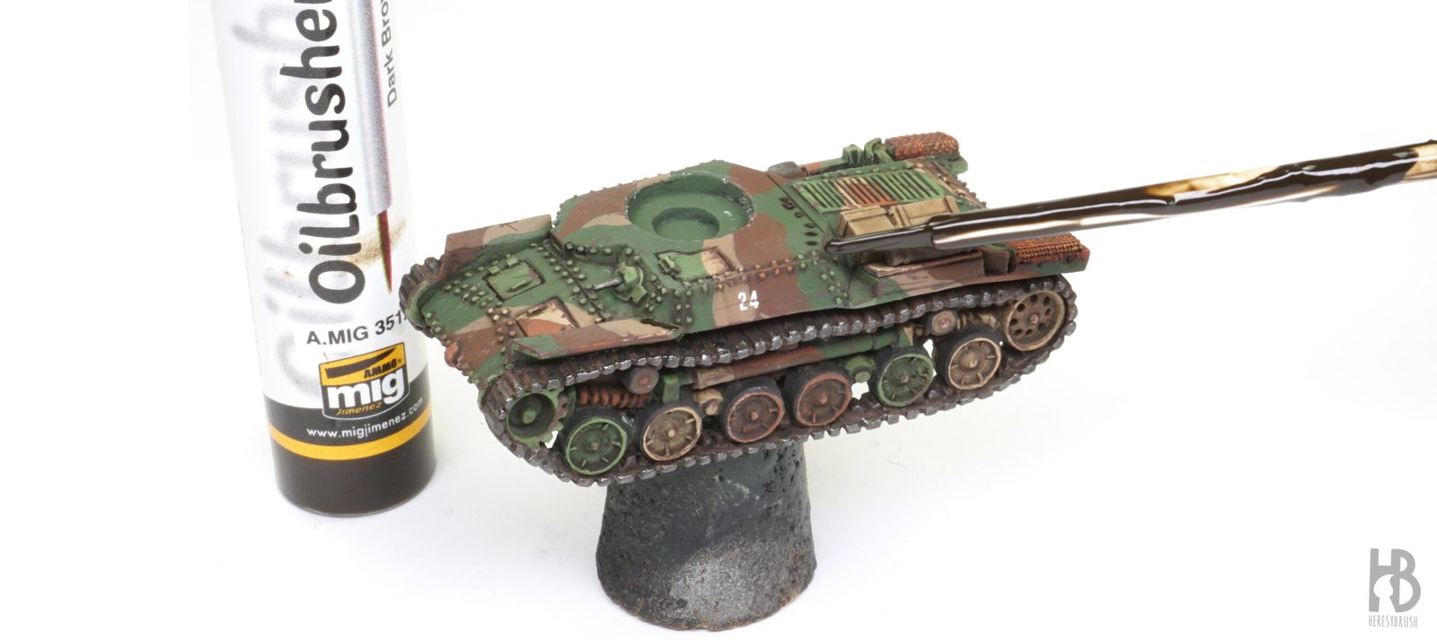 The second technique we are going to use to add depth to brush-painted or single-color tanks is oil painting. As mentioned earlier, oils dry very slowly, which makes them ideal for blending and creating smooth color transitions. This property allows us to build up subtle shading and variation in tone with great control. We can take advantage of this by applying a dark brown oil paint, such as Dark Brown A.MIG 3512, to specific areas where we want to simulate shadows or darken/deepen the color, such as the lower or rear sections of certain panels, around hatches, or along recesses.