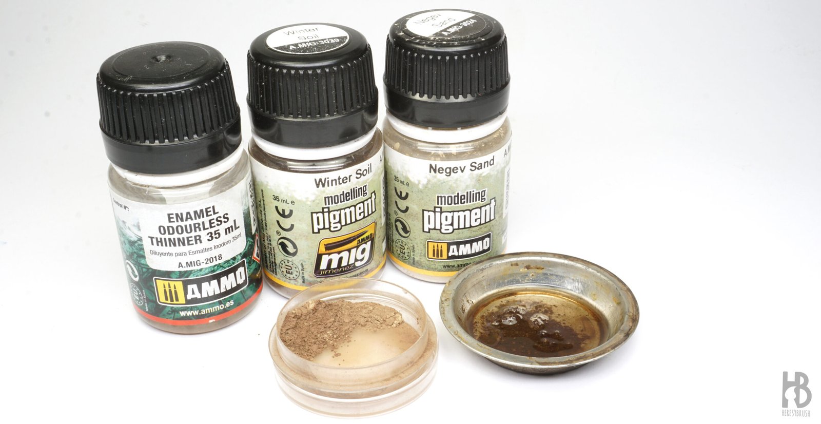 The next weathering effect is dust on the tracks. The easiest and most effective way to achieve this is by using pigments. These are essentially colored powders. To apply them, we can resuspend (not dissolve) them in 50% enamel thinner to create a wash-like consistency. Because the pigments remain as solid particles in suspension, it is a good idea to use at least two different tones to add depth and variation to the effect: each color will retain its individual characteristics, resulting in a more natural and realistic appearance.