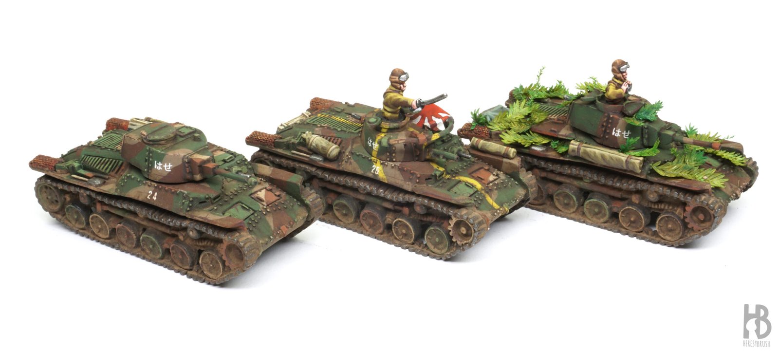 For this tutorial, we will be using one of the newly released Japanese tanks by Battlefront Miniatures in 15mm (scale 1:100), the Type 97 Chi-Ha, the workhorse of the Imperial Japanese Army during World War II. In the early years of the war, Japanese tanks were typically painted in khaki or yellow-brown, but as jungle combat intensified the army adopted a tritonal camouflage scheme. This pattern featured grass green (kusa iro), earth brown (tsuchi iro), and sand yellow (tsuchi kusa iro). As the war progressed, green became the standard base color, with camouflage patterns applied by individual units rather than at the factory and normally following hard-edge shapes. This led to a wide variety of unique, non-standardized patterns across different vehicles. In the early war period, it was also common to see hand-painted yellow stripes, often arranged in intersecting “+” or “X” shapes, adding a distinctive and stylized element to Japanese tank camouflage. These vehicles were not typically repainted, so such early camouflage patterns remained visible on older tanks right up until the end of the war.