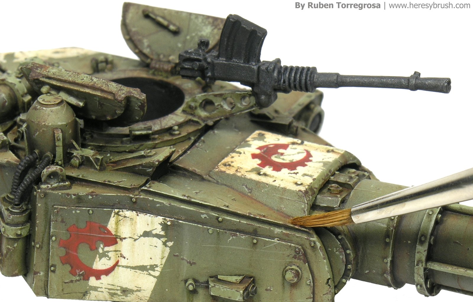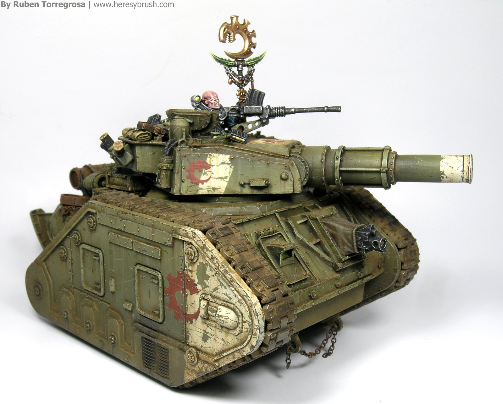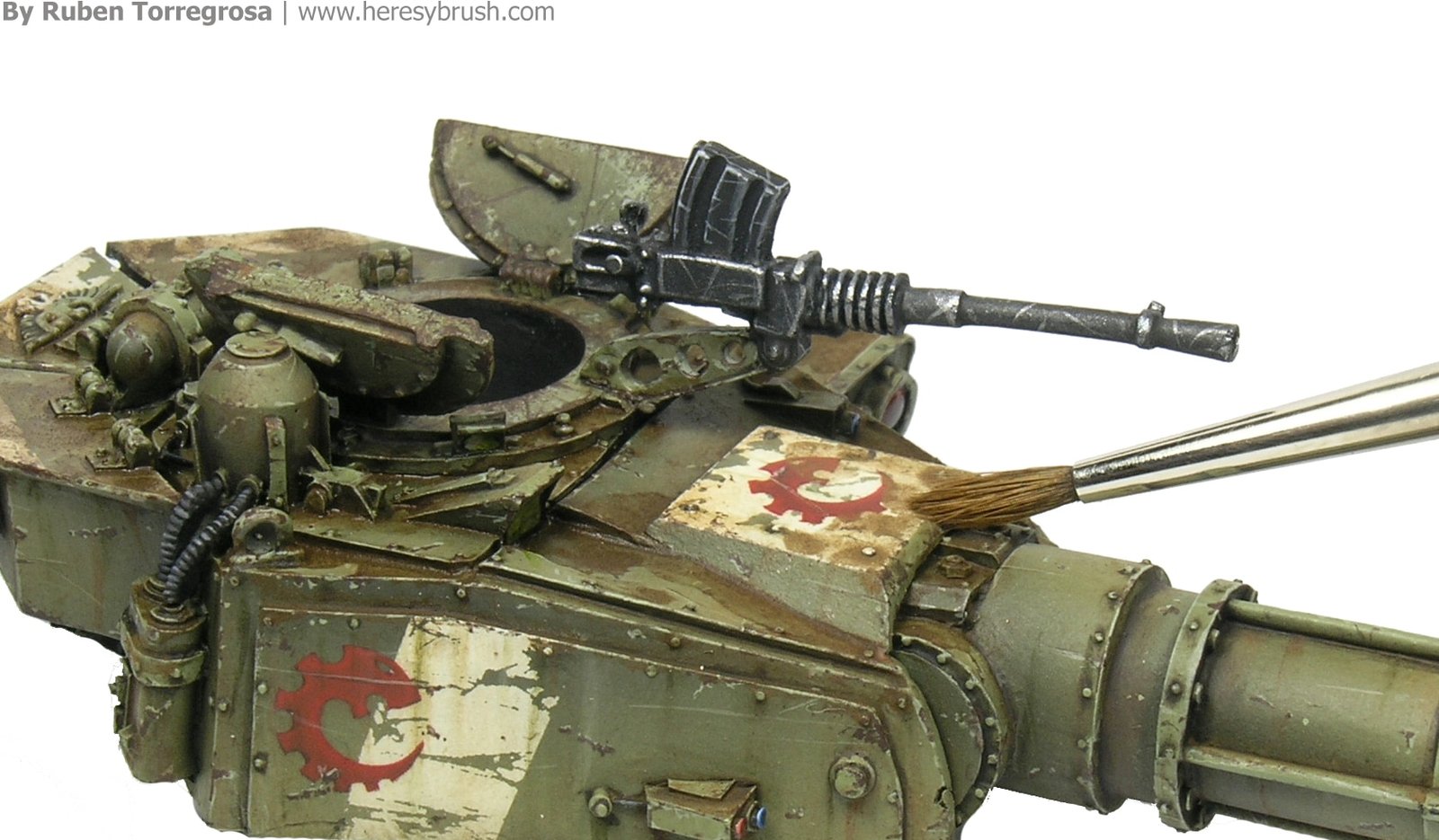 Hoy quiero compartir con vosotros una guía de pintura de un tanque de Warhammer 40k, un Leman Russ del Culto Genestealer. Hace unos 10 años me monté un ejército de la Guardia Imperial repleto de vehículos. Debía de tener al menos unos 12 tanques. ¡me encantaban esos enormes y poderosos monstruos de acero! Especialmente las versiones diseñadas por Forge World, mucho más estilizadas y carismáticas. Sin embargo, en aquella época no invertía demasiado tiempo en pintar miniaturas: con pincel pinté un camuflaje a tres colores; y arreando. Por supuesto, no les hice absolutamente nada de “weathering”. Curiosamente, tras dejar de coleccionar miniaturas de Warhammer me empecé a interesar más en la pintura. En los últimos años he aprendido un montón de técnicas diferentes para pintar y envejecer tanques. Y teniendo en cuenta mi pasión por aquellas bestias de acero, una espinita se me fue clavando poco a poco, hasta que me convencí de que tenía que aplicar todo lo que había aprendido en un tanque de Warhammer 40k. Aunque hace unos meses lo intenté con un pequeño vehículo de reconocimiento (este Sentinel), todavía tenía el objetivo de pintar un tanque per sé, algo más grande. Especialmente, un Leman Russ. Finalmente, puedo decir: ¡objetivo cumplido! Ha sido más complicado de lo que pensaba dado que he pasado de pintar tanques en 15mm a pintar un monstruenco enorme. Las superficies son mayores, sí, y aunque esto a primera vista facilita la pintura (más espacio sobre el que trabajar), también implica que he tenido re-adaptar muchas de las técnicas que me había especializado en hacer en 15mm (yo nunca he hecho envejecimiento en maquetas de escalas mayores, si no que directamente empecé con 15mm). Como nota personal, necesito más práctica, especialmente con los desconchones. Debo reconocer que la peor parte ha sido el tiempo invertido en pintar la bestia. Normalmente necesito dos días para pintar un carro en 15mm. Este proyecto ha durado una semana entera, incluyendo el fin de semana…