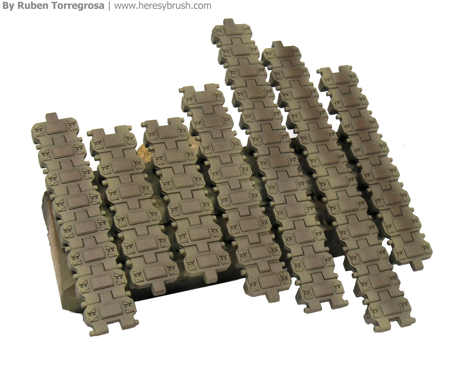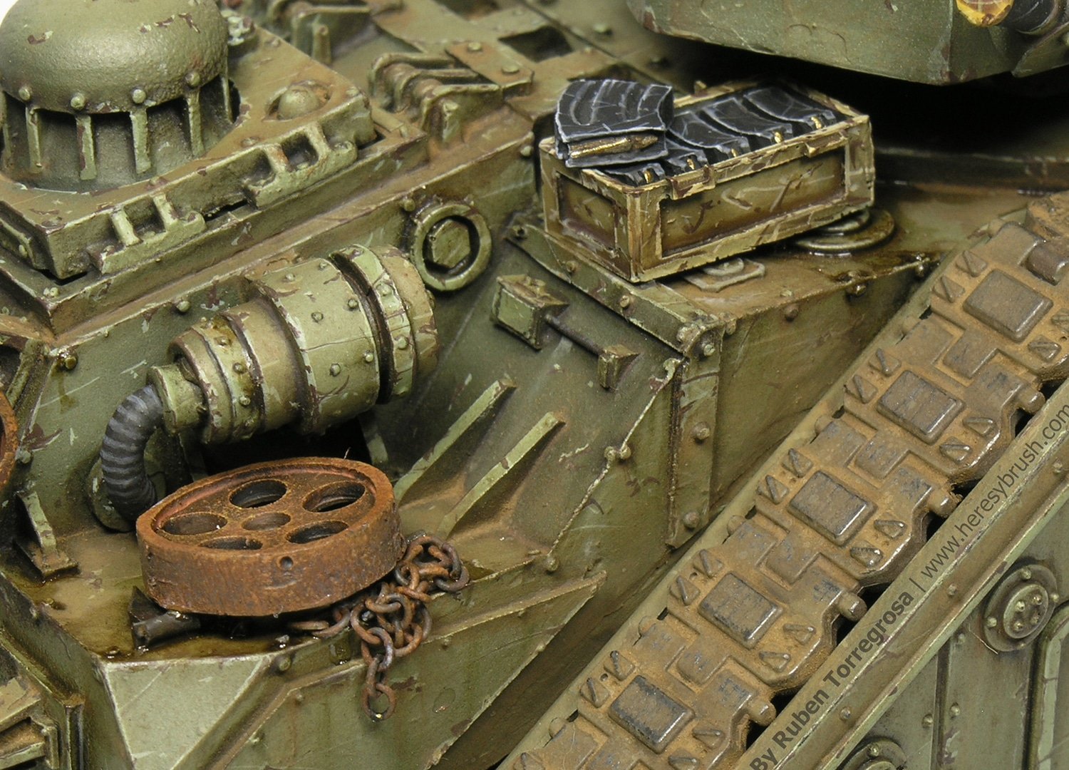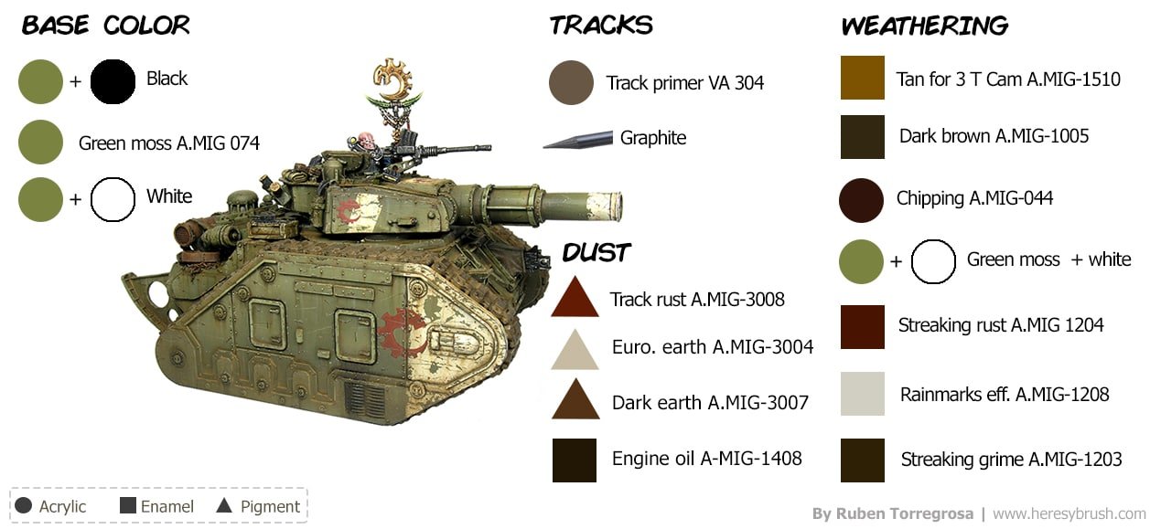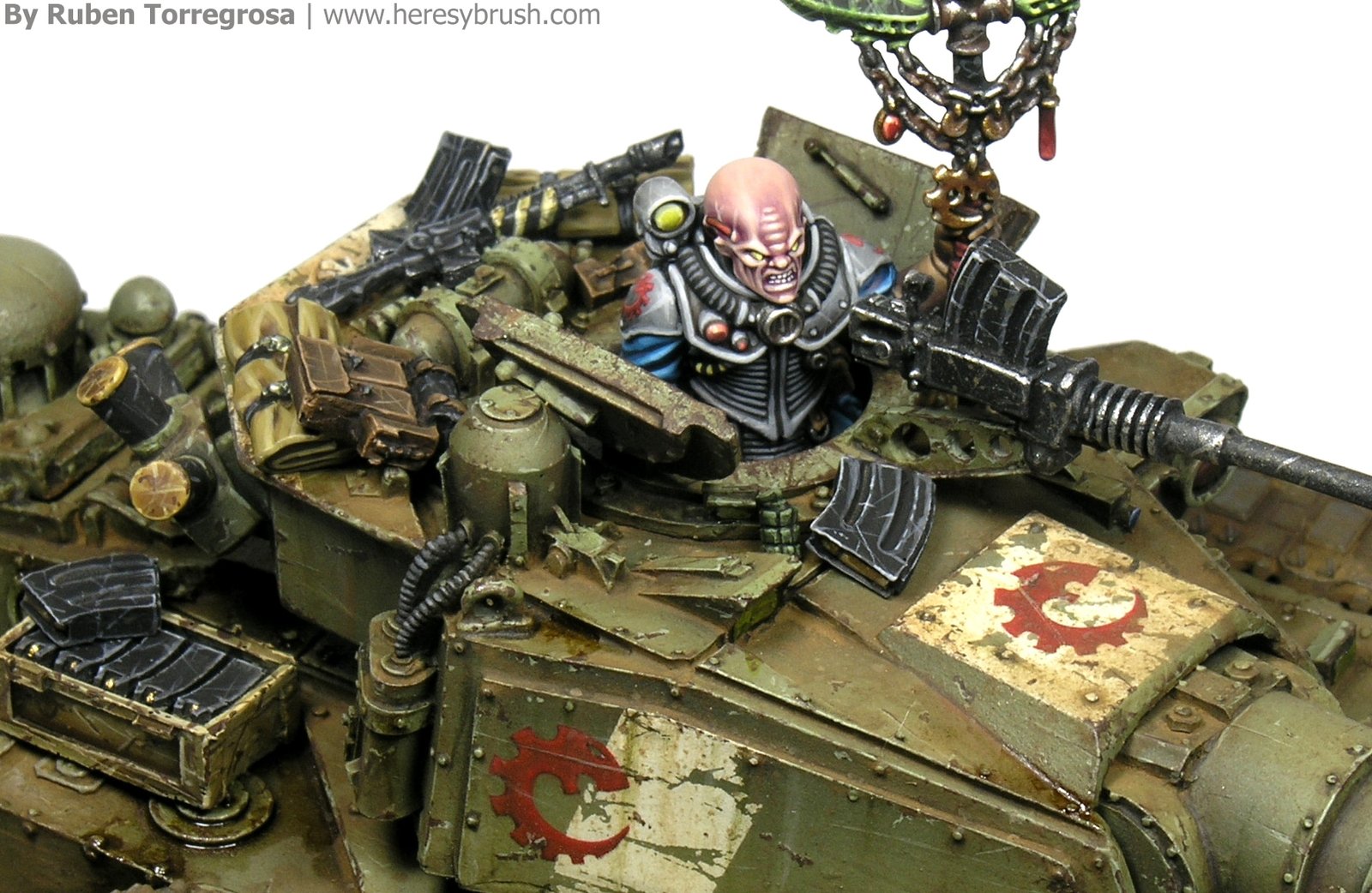 Hoy quiero compartir con vosotros una guía de pintura de un tanque de Warhammer 40k, un Leman Russ del Culto Genestealer. Hace unos 10 años me monté un ejército de la Guardia Imperial repleto de vehículos. Debía de tener al menos unos 12 tanques. ¡me encantaban esos enormes y poderosos monstruos de acero! Especialmente las versiones diseñadas por Forge World, mucho más estilizadas y carismáticas. Sin embargo, en aquella época no invertía demasiado tiempo en pintar miniaturas: con pincel pinté un camuflaje a tres colores; y arreando. Por supuesto, no les hice absolutamente nada de “weathering”. Curiosamente, tras dejar de coleccionar miniaturas de Warhammer me empecé a interesar más en la pintura. En los últimos años he aprendido un montón de técnicas diferentes para pintar y envejecer tanques. Y teniendo en cuenta mi pasión por aquellas bestias de acero, una espinita se me fue clavando poco a poco, hasta que me convencí de que tenía que aplicar todo lo que había aprendido en un tanque de Warhammer 40k. Aunque hace unos meses lo intenté con un pequeño vehículo de reconocimiento (este Sentinel), todavía tenía el objetivo de pintar un tanque per sé, algo más grande. Especialmente, un Leman Russ. Finalmente, puedo decir: ¡objetivo cumplido! Ha sido más complicado de lo que pensaba dado que he pasado de pintar tanques en 15mm a pintar un monstruenco enorme. Las superficies son mayores, sí, y aunque esto a primera vista facilita la pintura (más espacio sobre el que trabajar), también implica que he tenido re-adaptar muchas de las técnicas que me había especializado en hacer en 15mm (yo nunca he hecho envejecimiento en maquetas de escalas mayores, si no que directamente empecé con 15mm). Como nota personal, necesito más práctica, especialmente con los desconchones. Debo reconocer que la peor parte ha sido el tiempo invertido en pintar la bestia. Normalmente necesito dos días para pintar un carro en 15mm. Este proyecto ha durado una semana entera, incluyendo el fin de semana…