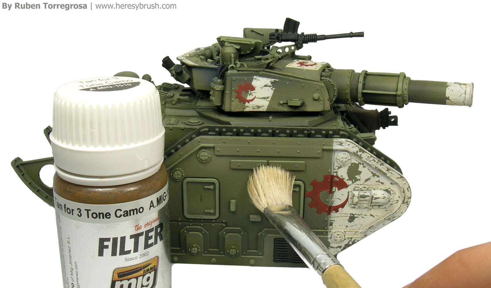Es importante tener en cuenta que ahora vamos a dejar de utilizar pinturas acrílicas y vamos a usar esmaltes. Los acrílicos y los esmaltes son DIFERENTES. Los primeros se disuelven con agua; mientras que para los segundos utilizamos White Spirit o esencia de trementina (¡no aguarrás puro! ¡Nunca!). El primer efecto que vamos a aplicar es un filtro marrón (como el Tan for 3 Tone Camo, A.MIG-1510). El objetivo del filtro es doble: (1) dar un toque más homogéneo a todo el conjunto y (2) añadir un ligero tono marrón. Tener en cuenta que aunque un filtro consiste en pintura muy diluida, un filtro no es una tinta, lavado o un shade de Citadel. No. Filtros y lavados son diferentes en composición y modo de uso (más info aquí). Para aplicar un filtro primero cargamos el pincel con pintura, después descargamos la mayor parte sobre un papel o trapo y es entonces cuando finalmente pasamos al modelo, dando suaves pasadas con un pincel plano. ¡No encharquéis la superficie! Si es así, descargar de nuevo el pincel sobre un papel.