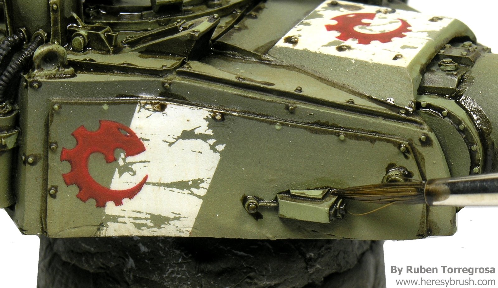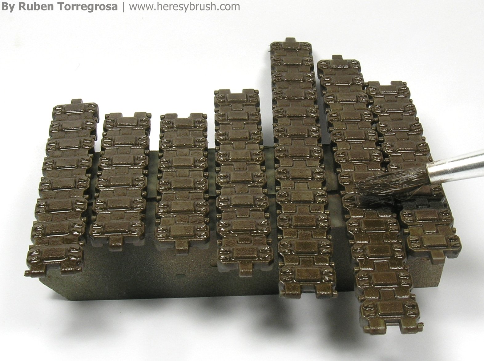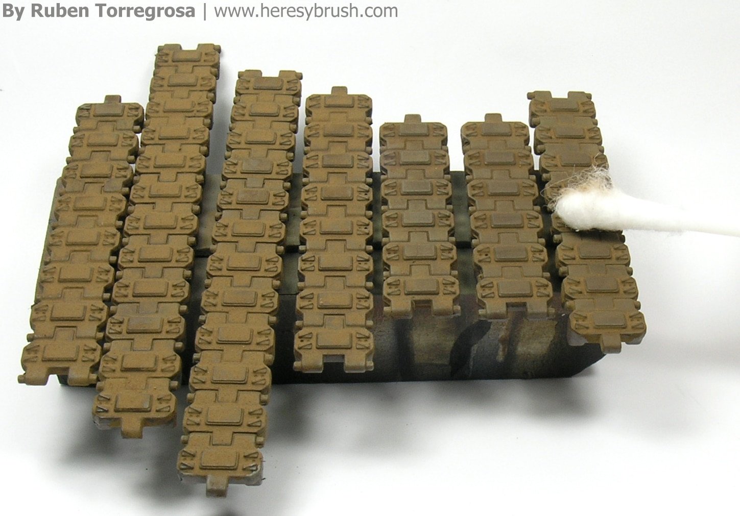 Para el siguiente paso necesitamos pigmentos. Podemos mezclar varios pigmentos de diferentes colores para enriquecer el resultado final. Vamos a diluir la mezcla con White Spirit para crear una especie de lavado, que vamos a aplicar a lo largo de las superficies horizontales (especialmente alrededor de los detalles y en las esquinas) y en la parte inferior de los laterales o en cualquier zona próxima al suelo o a las orugas. Es decir, cualquier zona expuesta al polvo.