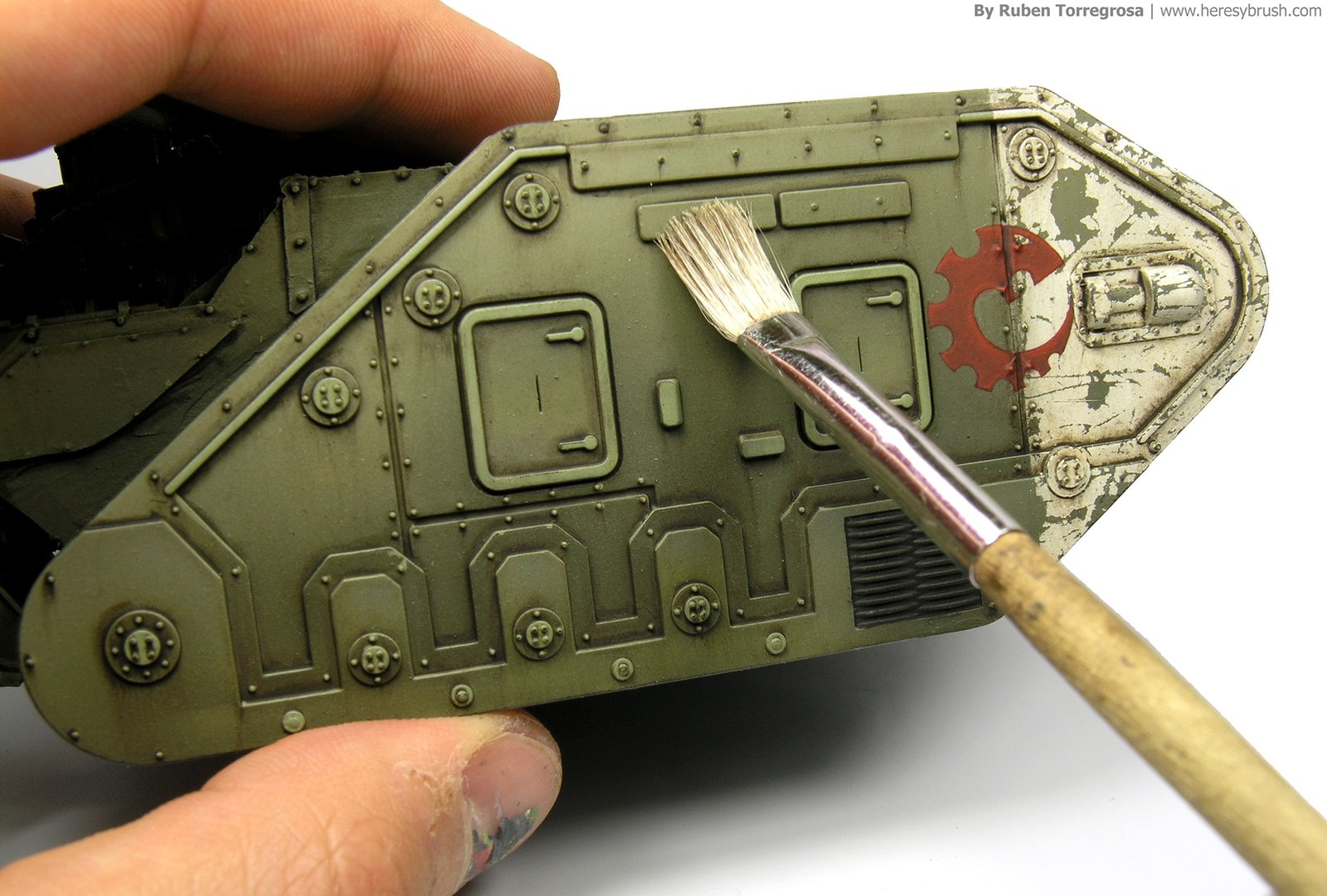 Vamos a dividir la técnica de los desconchones en dos partes: primero usaremos un color claro y después usaremos uno oscuro. En la primera etapa usamos un color claro para representar desgastes superficiales, que no han llegado al metal. Como color claro podemos usar el mismo que usamos para pintar la última luz a pincel (Green moss + White, 1:2). Con este color haremos dos cosas: (1) aplicamos un perfilado por todos los bordes y aristas. Podemos utilizar el pincel horizontalmente, usando el cuerpo de las cerdas en lugar de la punta del pincel. Y (2), pintamos pequeños arañazos y desconchones. Para esto usaremos la punta del pincel para pintar pequeños puntitos y delgadas líneas de forma aleatoria pero usando la lógica. Cuanto más expuesta está una zona al desgaste, más estropeada estará. Por ejemplo, las escotillas o manecillas. Yo prefiero utilizar un pincel en lugar de la técnica de la esponja para pintar los desconchones. Con el pincel nos aseguramos de tener un control absoluto de donde cae la pintura. Con la esponja, no. A mi modo de ver, los resultados de la esponja son un poco artificiales; si bien pueden ser muy útiles en algunas circunstancias (como veremos luego). Para más información sobre desconchones os recuerdo que podéis ver los dos artículos que referencié al principio del artículo o bien este otro.