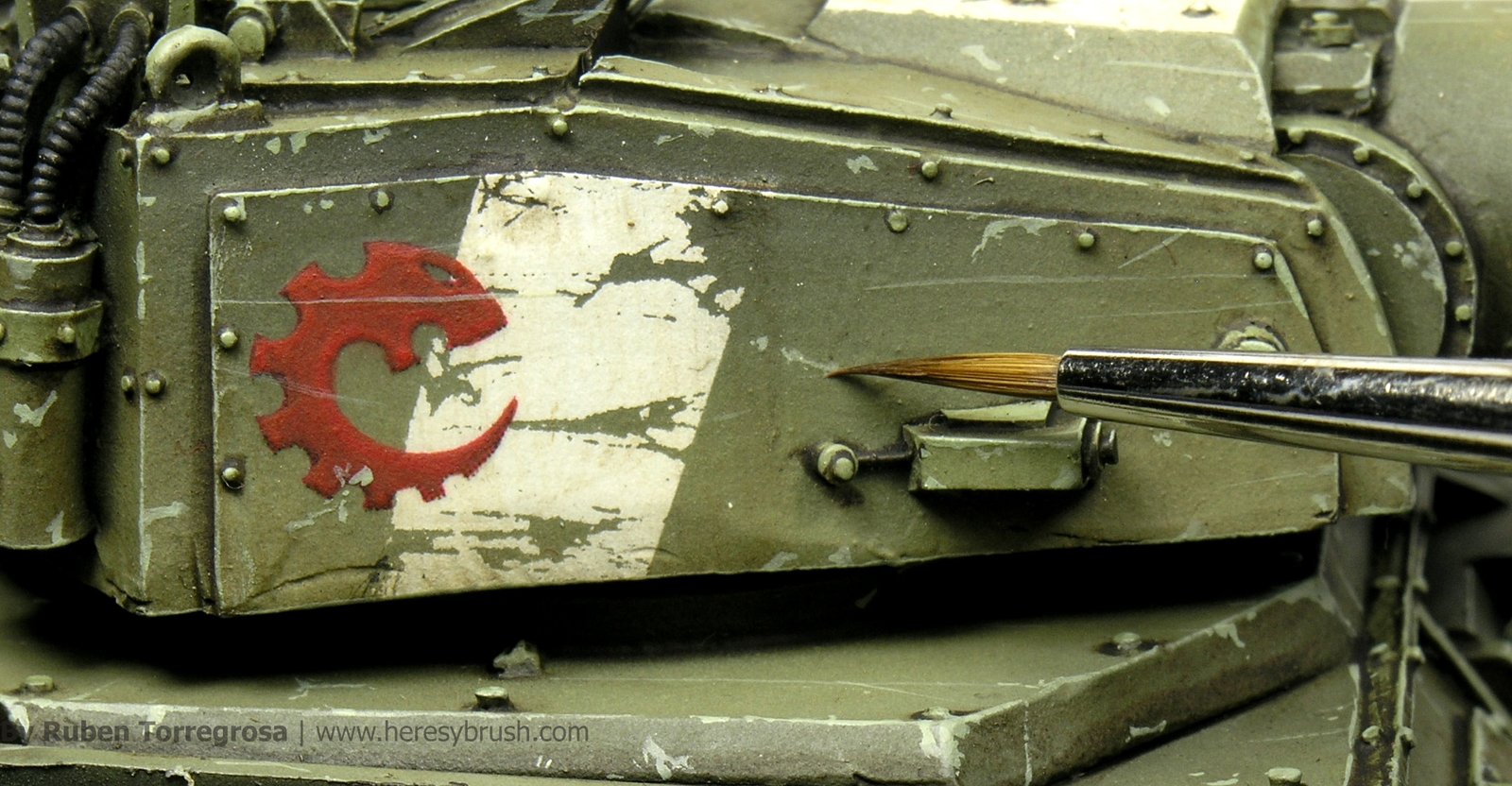 Ahora usaremos el líquido para desconchados (chipping fluid) de AMMO para simular el desgaste de la pintura blanca que representa las marcas del ejército. Por ejemplo, yo he pintado la boca del cañón, algunas partes de la torreta y la parte frontal de los laterales. Puedes ver más información sobre esta técnica aquí y aquí.