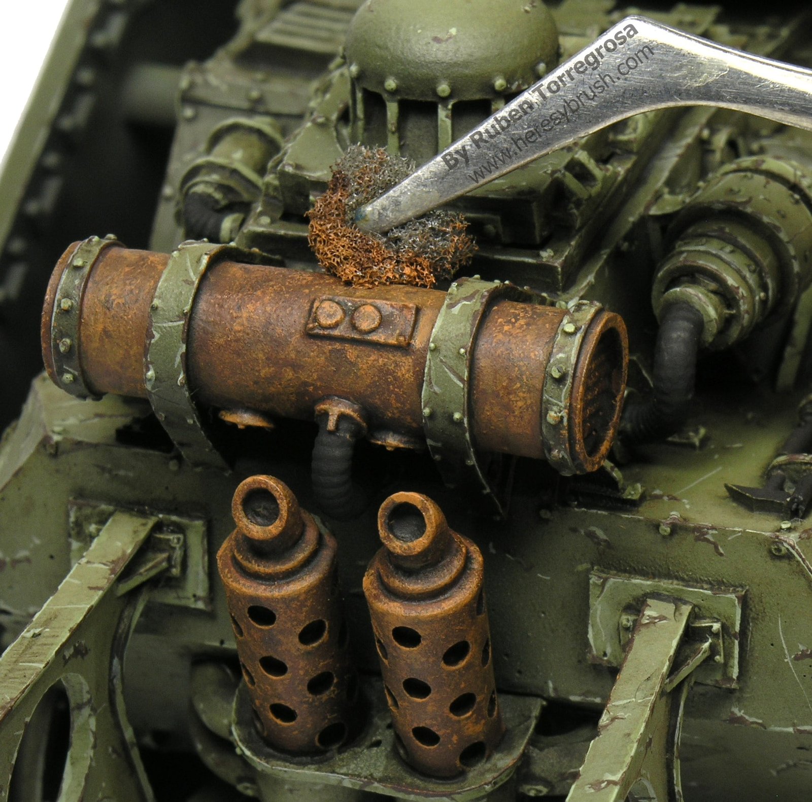 Aunque antes arremetí contra la técnica de la esponja para simular desconchones, en realidad la utilicé para pintar la escotilla de la torreta y cúpula del comandante (la cual estaría muy manoseada y desgastada de tanto uso). Además, la técnica de la esponja puede ser muy útil para representar zonas tremendamente oxidadas, como los escapes. Para representarlo necesitamos varios tonos ocres y naranjas. En mi caso, primero pinté los escapes completamente de color marrón mate (984, Vallejo). A continuación utilice la técnica de la esponja para añadir desconchones con dos colores: primero con Orange brown (982, Vallejo) y después con un marrón oscuro (Chipping A.MIG-044).