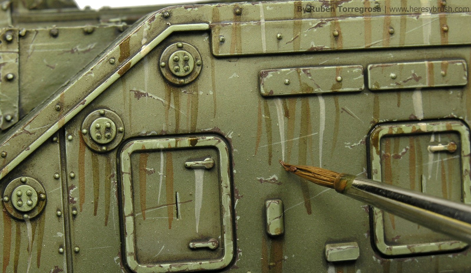 Podemos añadir efectos de escurridos con esmaltes. Yy he usado tres: Streaking rust (A.MIG-1204), Rainmarks effect (A.MIG-1208) y Streaking grime (A.MIG-1203). Con un pincel fino pintamos líneas verticales, de arriba-abajo combinando estos tres colores. Los escurridos pueden empezar en un remache, en un desconchón o simplemente desde la parte superior de la placa de blindaje. Solo los ponemos en los paneles verticales. Podéis utilizar otros colores diferentes dependiendo del ambiente en el cual esté luchando el tanque (no es lo mismo el desierto que una zona pantanosa).