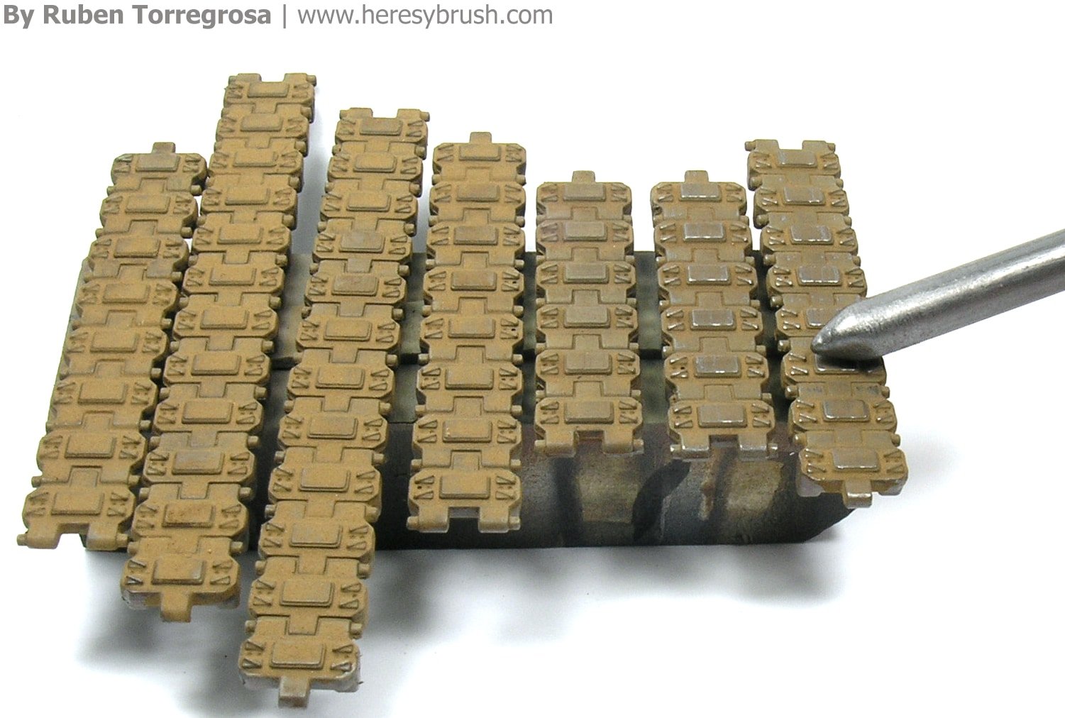 Esperar un par de horas hasta que el White Spirit esté totalmente evaporado. Después, con un pincel viejo o un bastoncillo eliminamos con cuidado la mayor parte de los pigmentos, tan solo dejándolo recluido a los recovecos. En este punto pegué las cadenas que había pintado en pararelo.